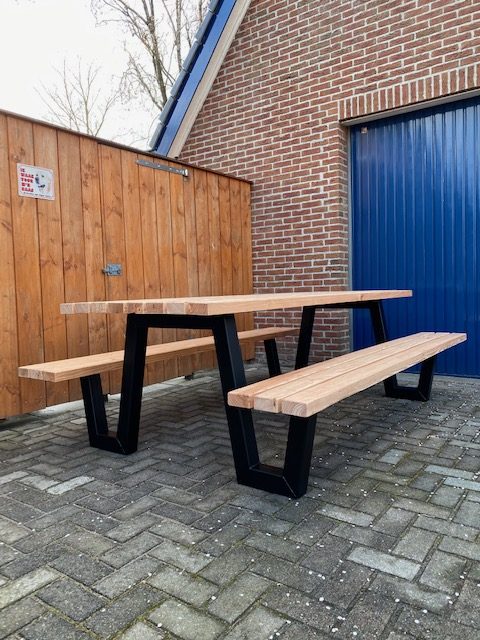 Robuuste picknicktafel van lariks hout met stalen poten.